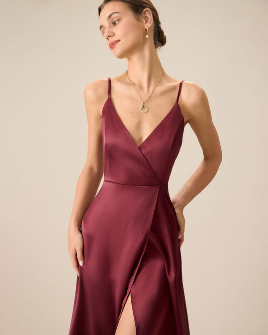 Blue Satin Boat Neck Slit Sleeveless Midi Dress