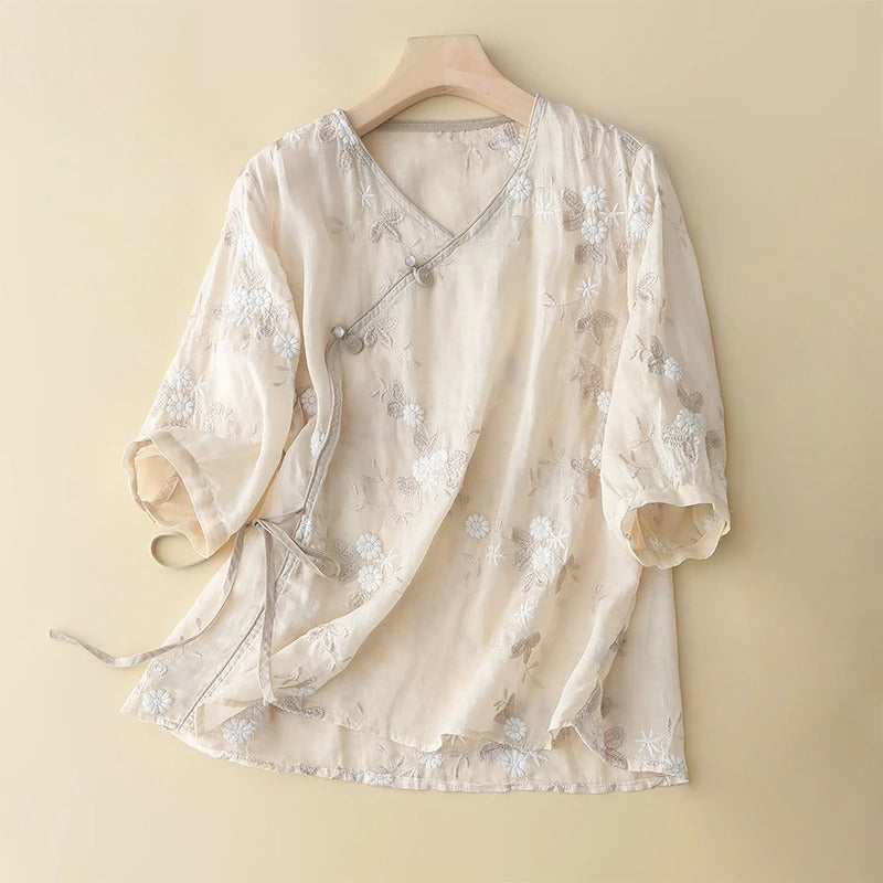 A whisper of vintage East meets modern romanticism. Crafted in gossamer linen, this blouse wraps the figure in soft asymmetry, traced with embroidered botanicals that feel both found and remembered. Hand-tied knots and gentle flourishes complete the look—artful, airy, and ineffably poetic.