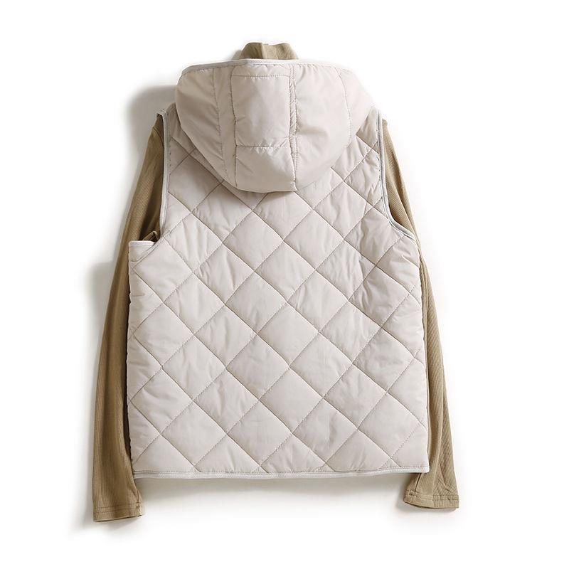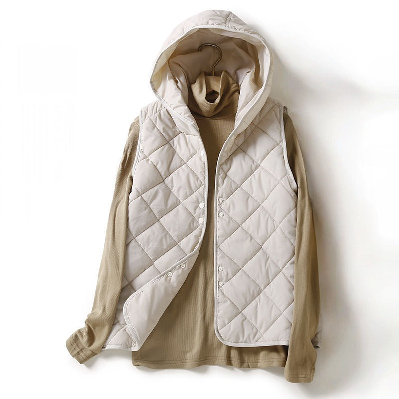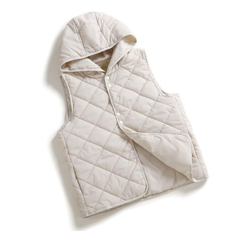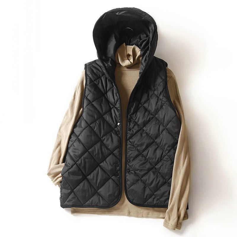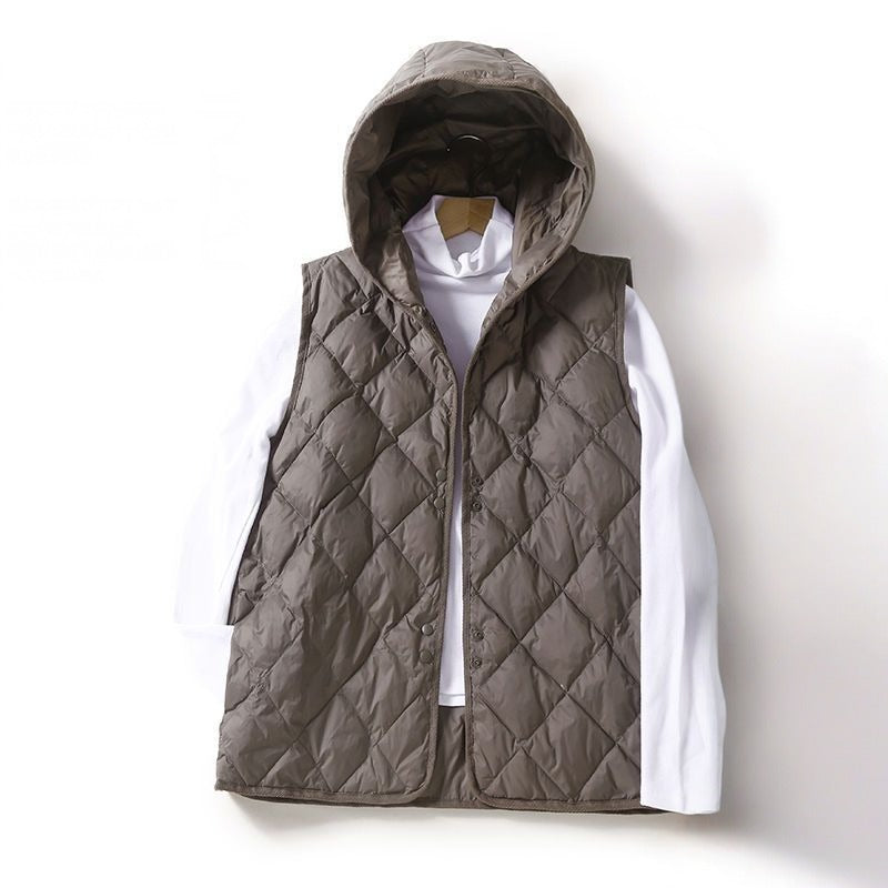 A study in weightless warmth, this quilted vest merges utilitarian detail with clean-lined restraint. Designed with a soft hood, diamond stitching, and an open front silhouette, it's a modern staple for layering through shifting skies.