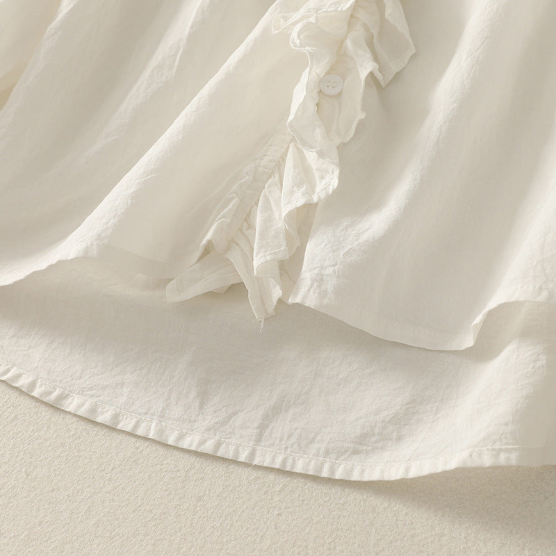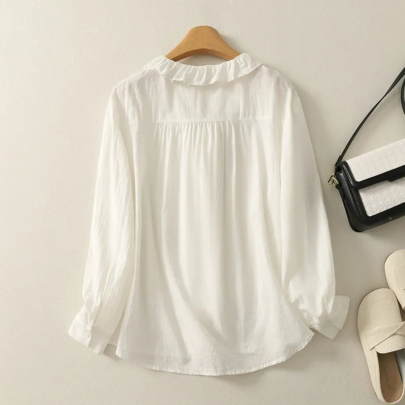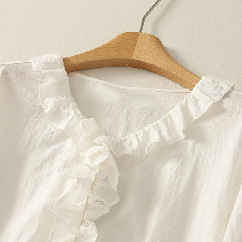 A flutter of romance rendered in gossamer linen—this blouse dances with cascading ruffles and soft femininity. Meant for poetry readings, vintage bookstores, and mornings spent chasing light.