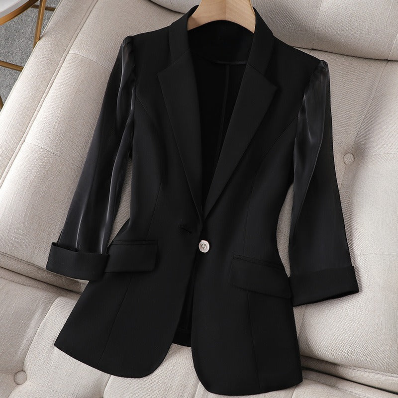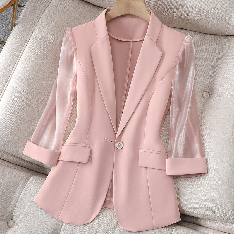 Cut in a tailored silhouette, this blazer strikes a balance between power and grace. The structured bodice meets sheer organza sleeves, bringing a whisper of softness to a commanding profile. A single button closure and notch lapel refine the look—layer it over everything from silk camis to crisp shirting.