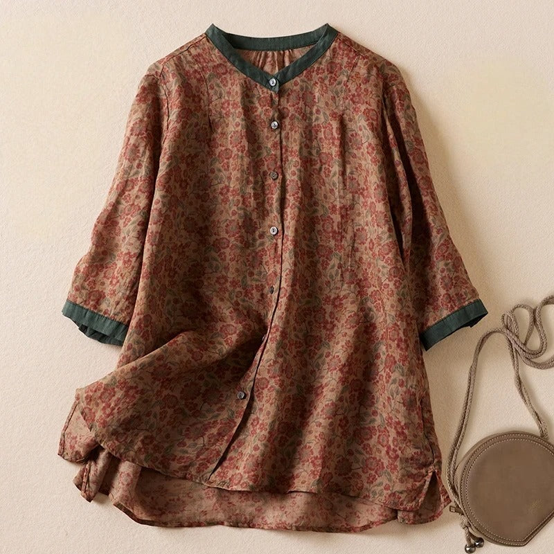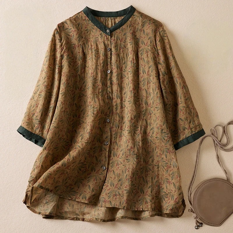 Woven from our featherlight Gossamer linen, this blouse carries an earthy calm through its gentle drape and standing collar. Subtle gathers and a flowing hem lend ease to its form—stitched for quiet moments and layered light.