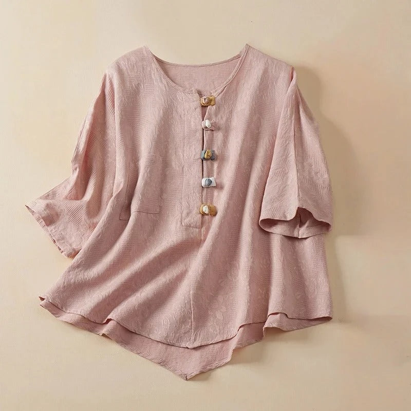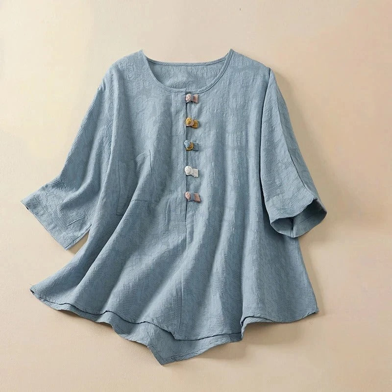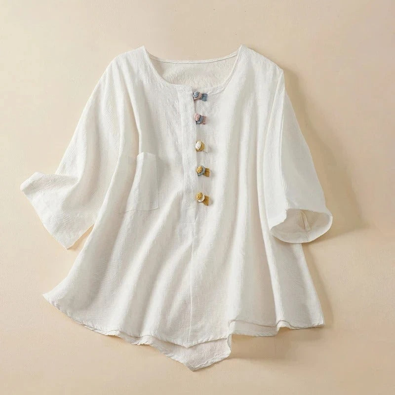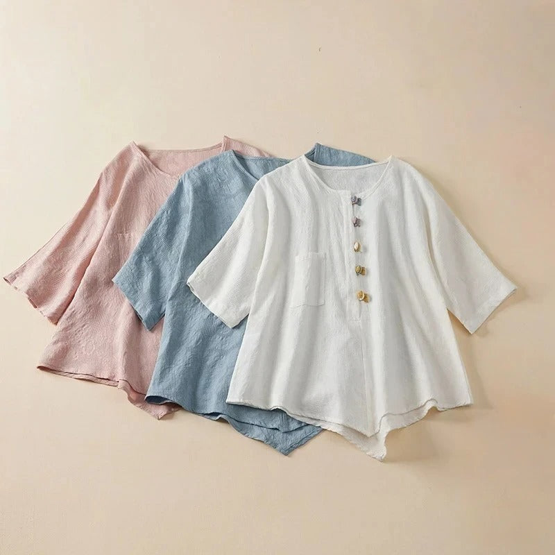 Textural, airy, and elevated—this Gossamer Linen shirt is a study in subtle charm. The playful contrast of handmade knotted buttons gives a crafted finish to its naturally draped silhouette.