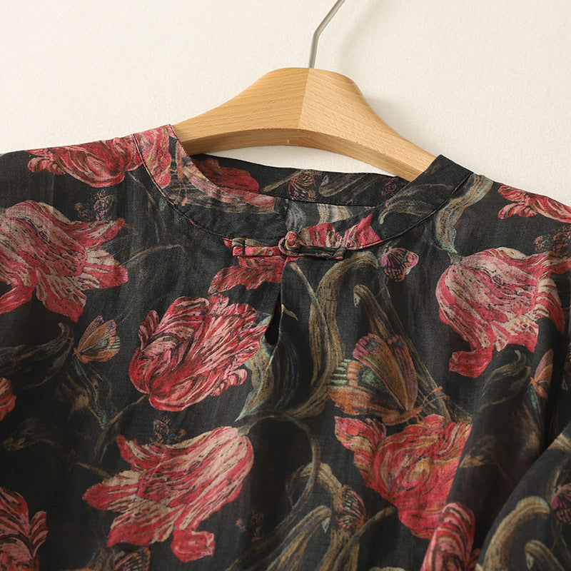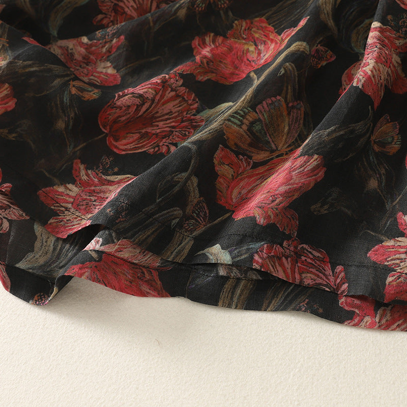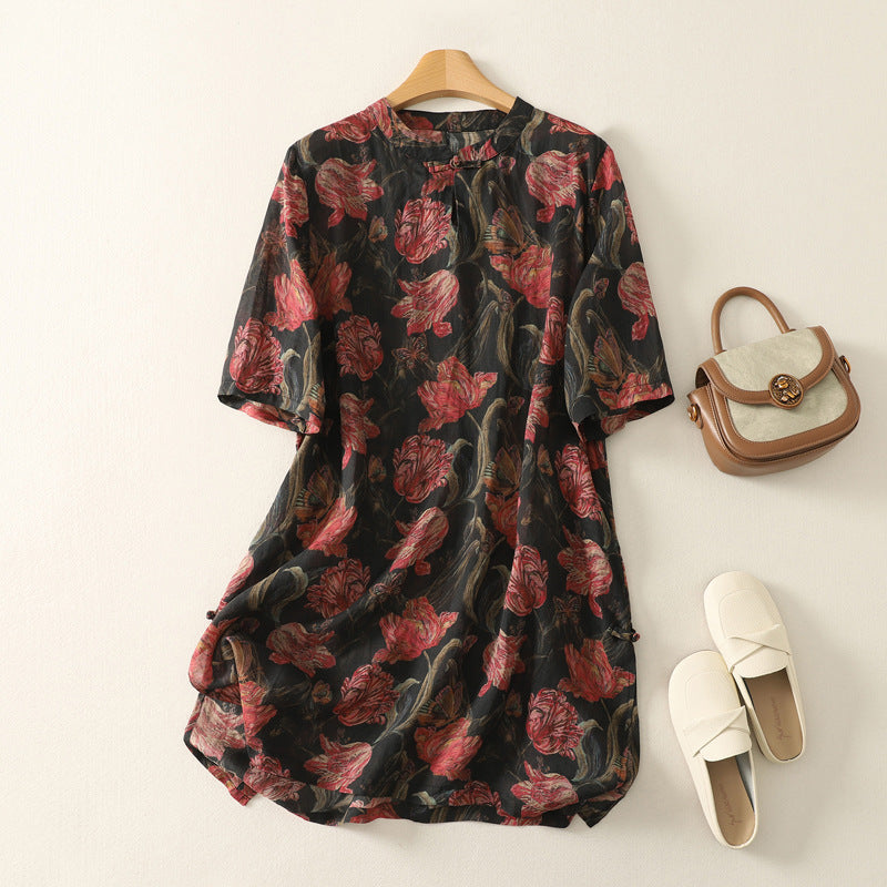 Woven from breathable linen, this mid-length dress flows with printed blooms and gathered volume. Subtle buttons and a rounded hem shape its relaxed form—stitched for slow walks and softened hours.