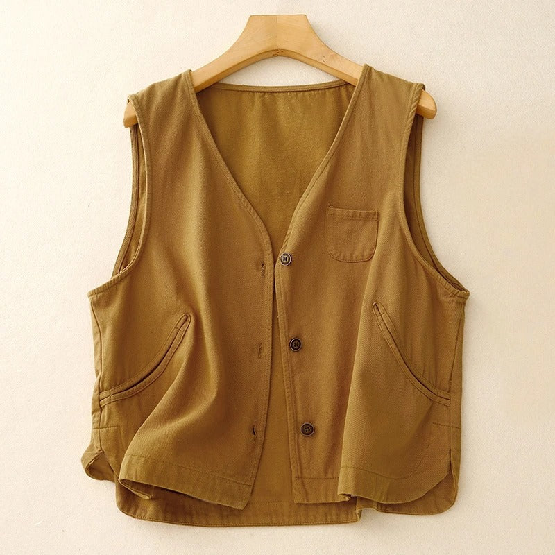 A whisper of summer air spun into linen. With a soft drape and curved pockets stitched like a sigh, this ivory vest layers like a second skin — breezy, tactile, and full of quiet intention.