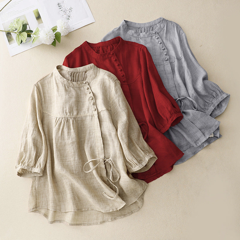 Made from pure gossamer linen, this blouse drapes with airy charm and quiet detail. The wrap-style tie and soft gathers shape a flattering silhouette, while the puffed sleeves and side buttons whisper of ease and balance.