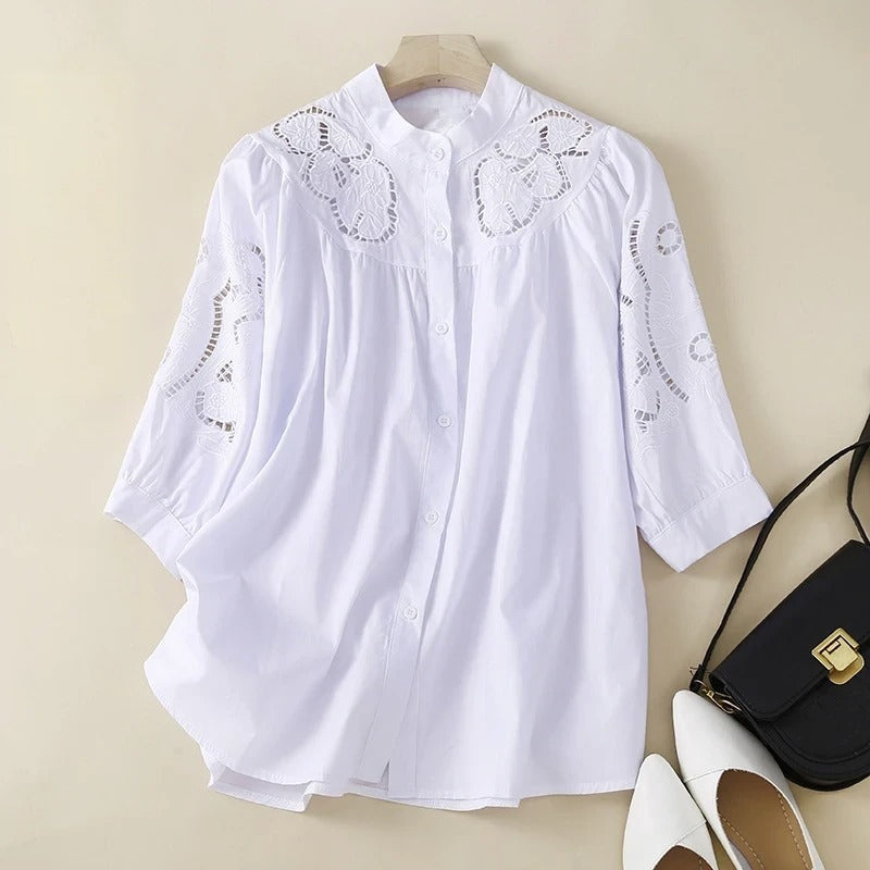 Spun from our airy Gossamer Linen, this blouse is all softness and sky. Intricate embroidery traces the shoulders like a whispered story, while the billowy shape floats through warm afternoons with grace.