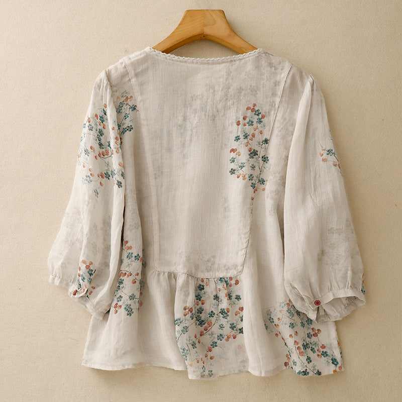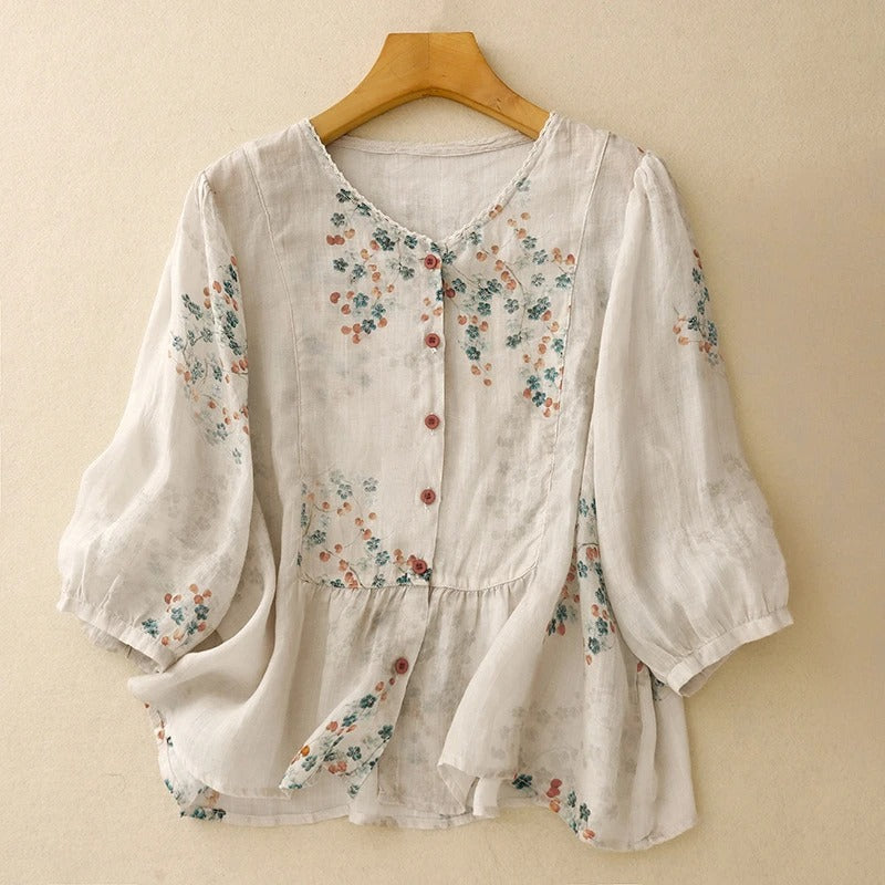 A storybook silhouette for slow, sun-washed mornings. Crafted from sheer gossamer linen, this blouse blooms with whisper-soft florals and gathers gently at the hem for a floaty, feminine shape. It wears like a breeze and moves like a thought—equal parts poetry and presence.