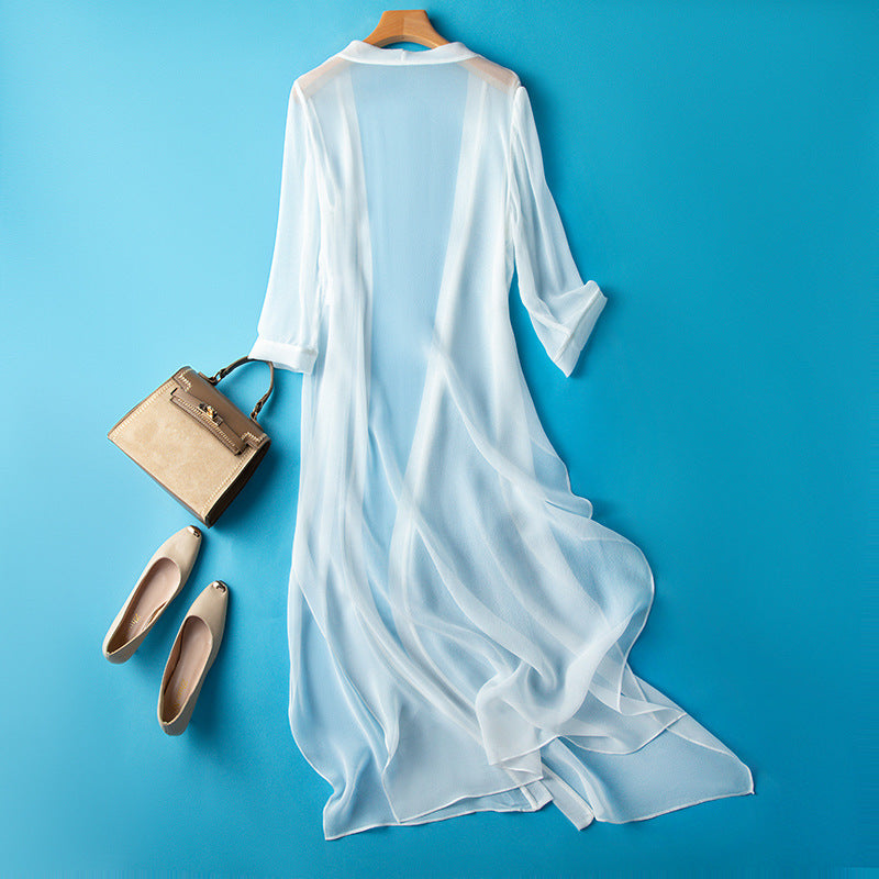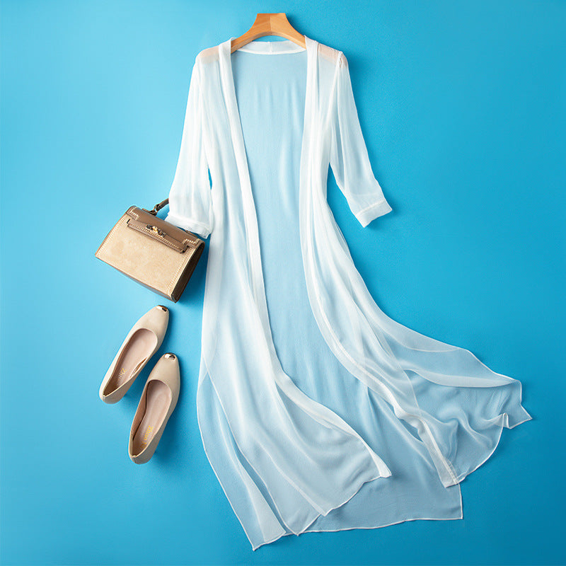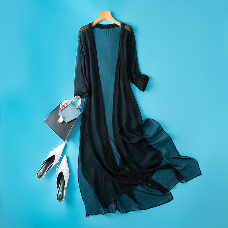 Woven from pure silk, this long overlay moves with gentle rhythm. Its sheer texture and fluid shape create a soft veil over summer layers—perfect for light coverage under an open sky.