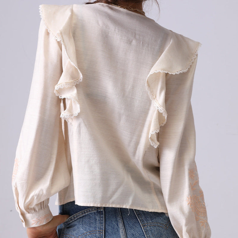 A romantic interplay of texture and tailoring, this linen blouse features gathered sleeves, tonal embroidery, and intricate lace trim. The soft drape flatters with every movement, lending charm to both daywear and dusk.