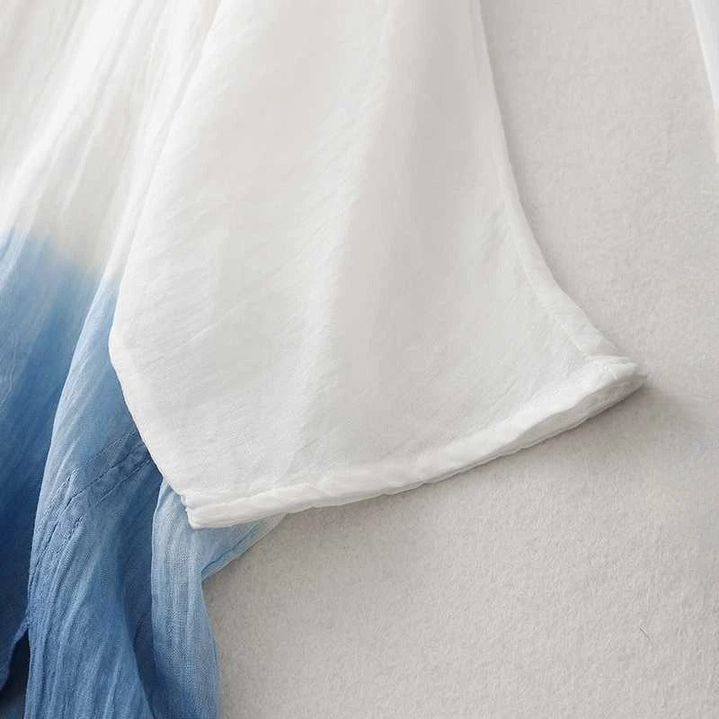 A vision in motion, this gossamer linen top catches the light like ocean spray at sunrise. The hand-dipped indigo wash spills into fluid folds, evoking far-flung beaches and spontaneous wanderings. Crinkled texture whispers of freedom; the silhouette flows with poetic ease.