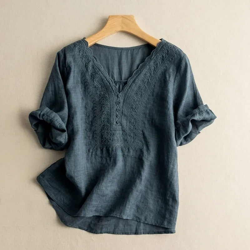 Crafted from linen, this blouse drapes with lightness and ease. Scalloped embroidery blooms around the neckline, while delicate buttons trail down like a quiet rhythm—stitched for mornings that linger and evenings that hum.