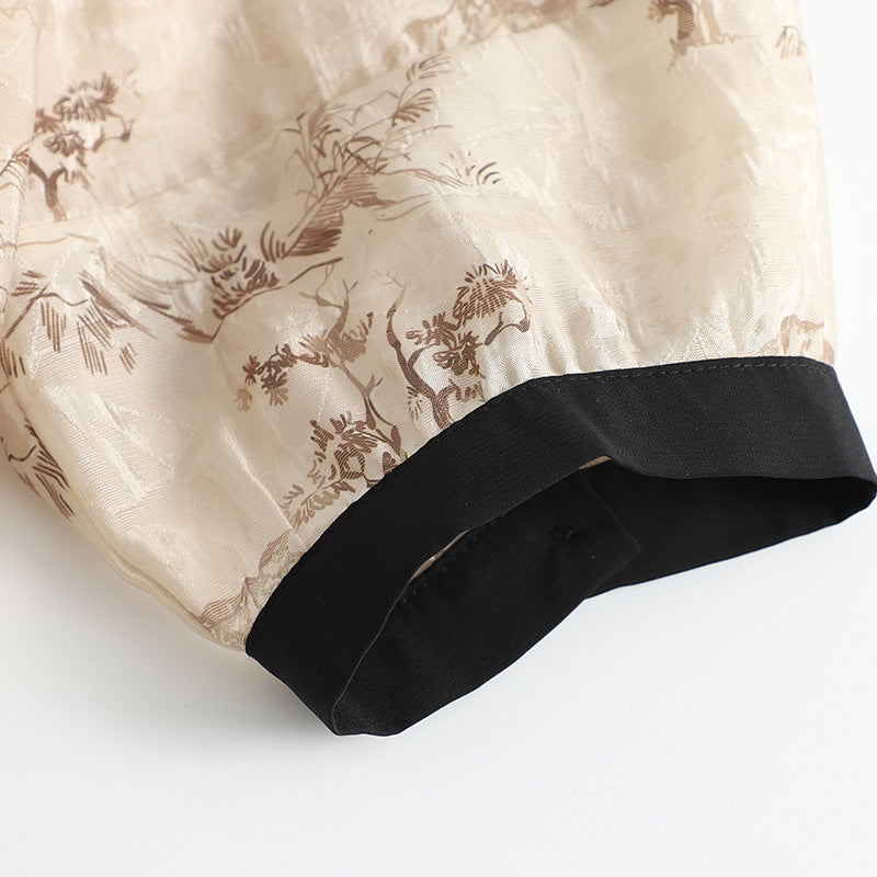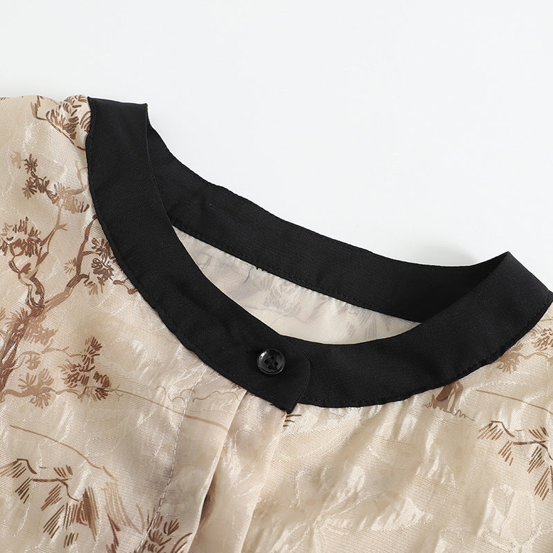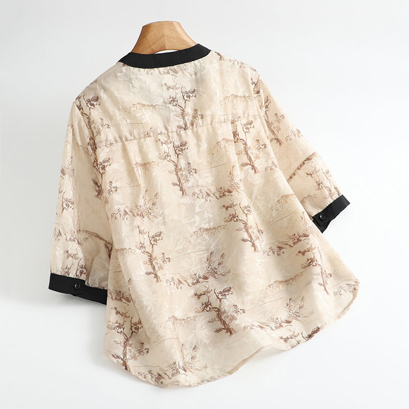 A whisper of linen, sketched with pastoral scenes that feel like dreams remembered. This blouse drapes with quiet structure, while contrast edging draws the eye inward—thoughtful, painterly, and steeped in storytelling.