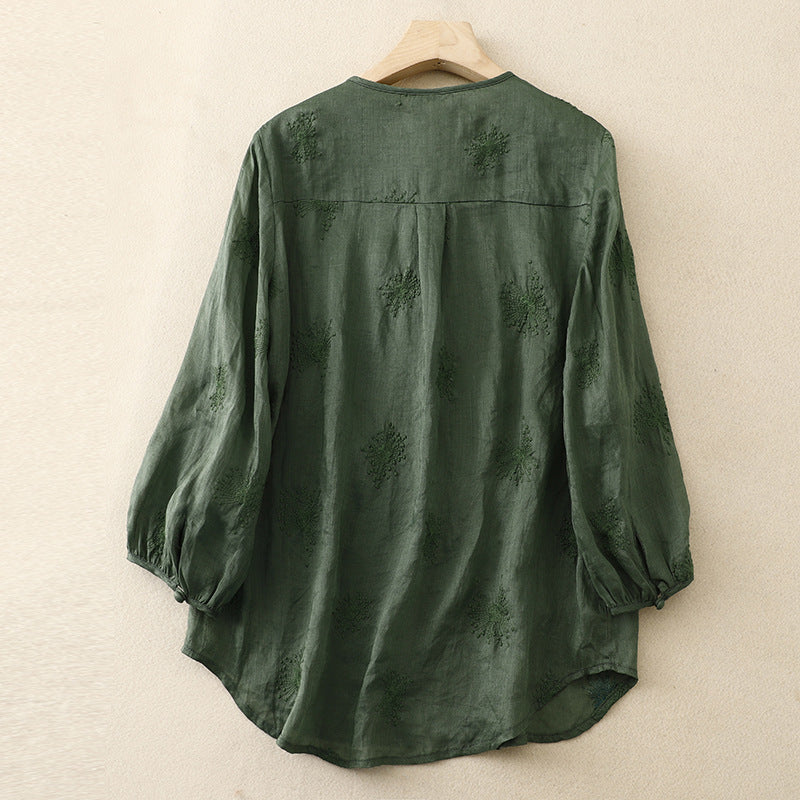 This blouse is a whisper in form—defined by a stand collar, covered front buttons, and delicate embroidery that blooms beneath the surface. Its ease of movement meets composed lines, a silhouette built for pause and presence.