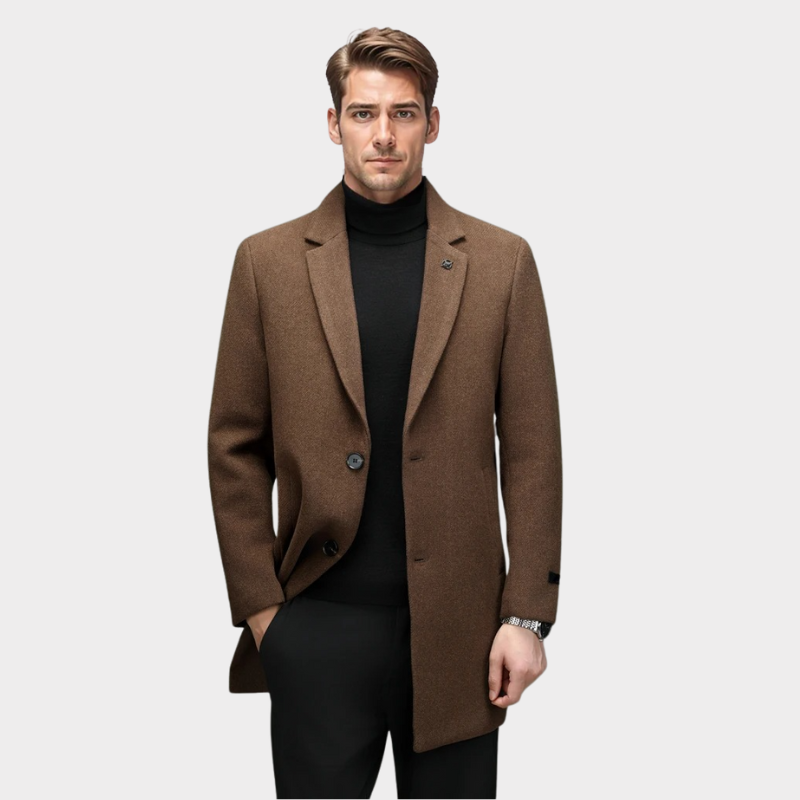 Dense wool craftsmanship transforms this overcoat into a barrier against the cold, offering enduring warmth and a sharp, tailored fit that redefines the essence of cold-weather luxury attire.