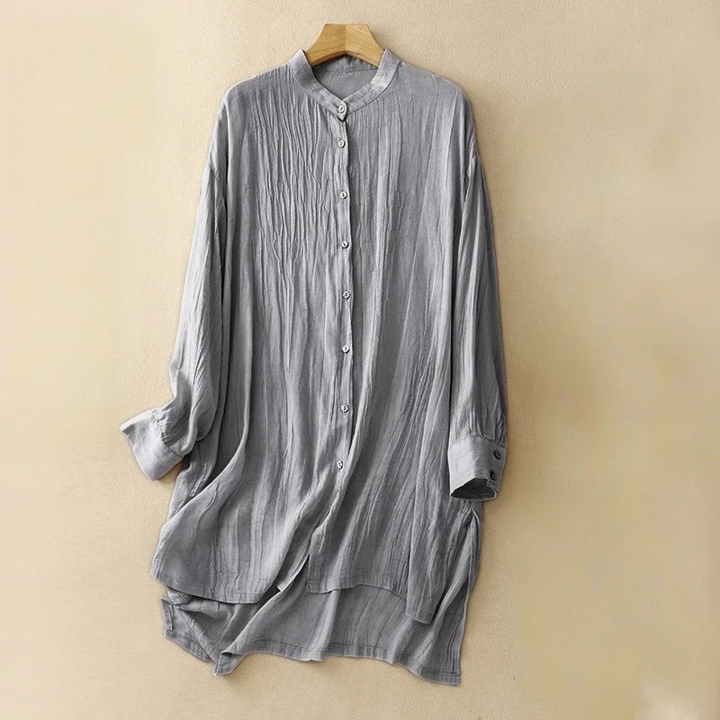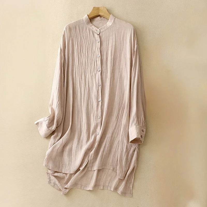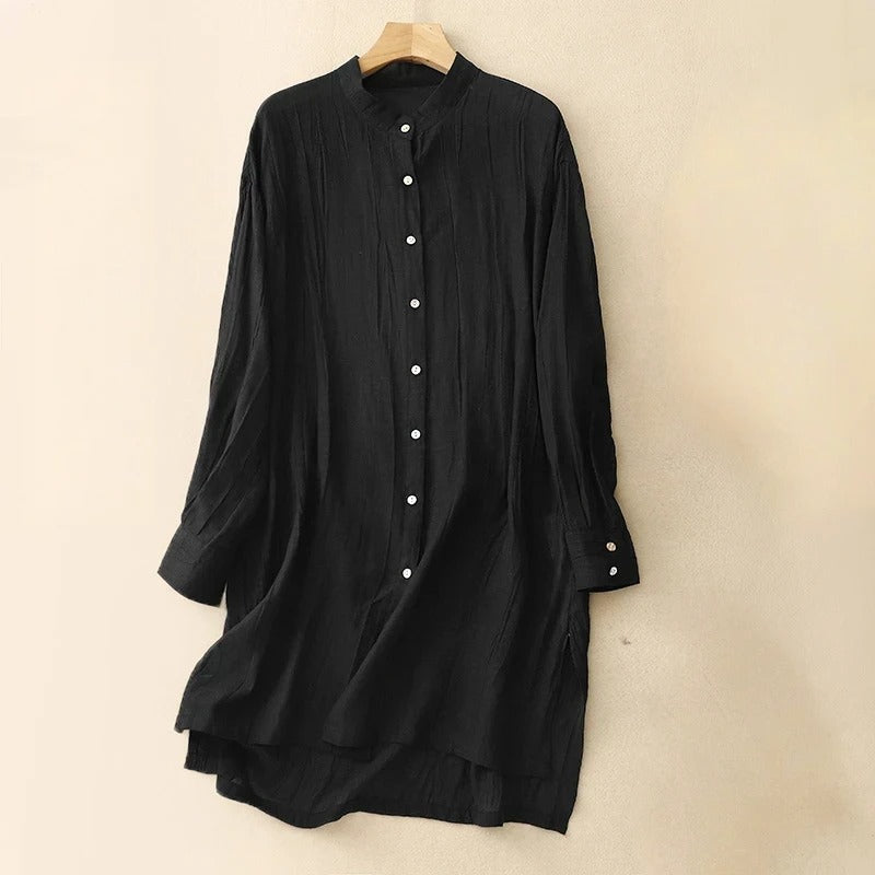 Woven from our featherlight Gossamer linen, this mid-length dress flows with quiet ease. A mandarin collar and soft pleats frame the silhouette, while delicate buttons add a gentle rhythm—an ode to calm days and subtle grace.